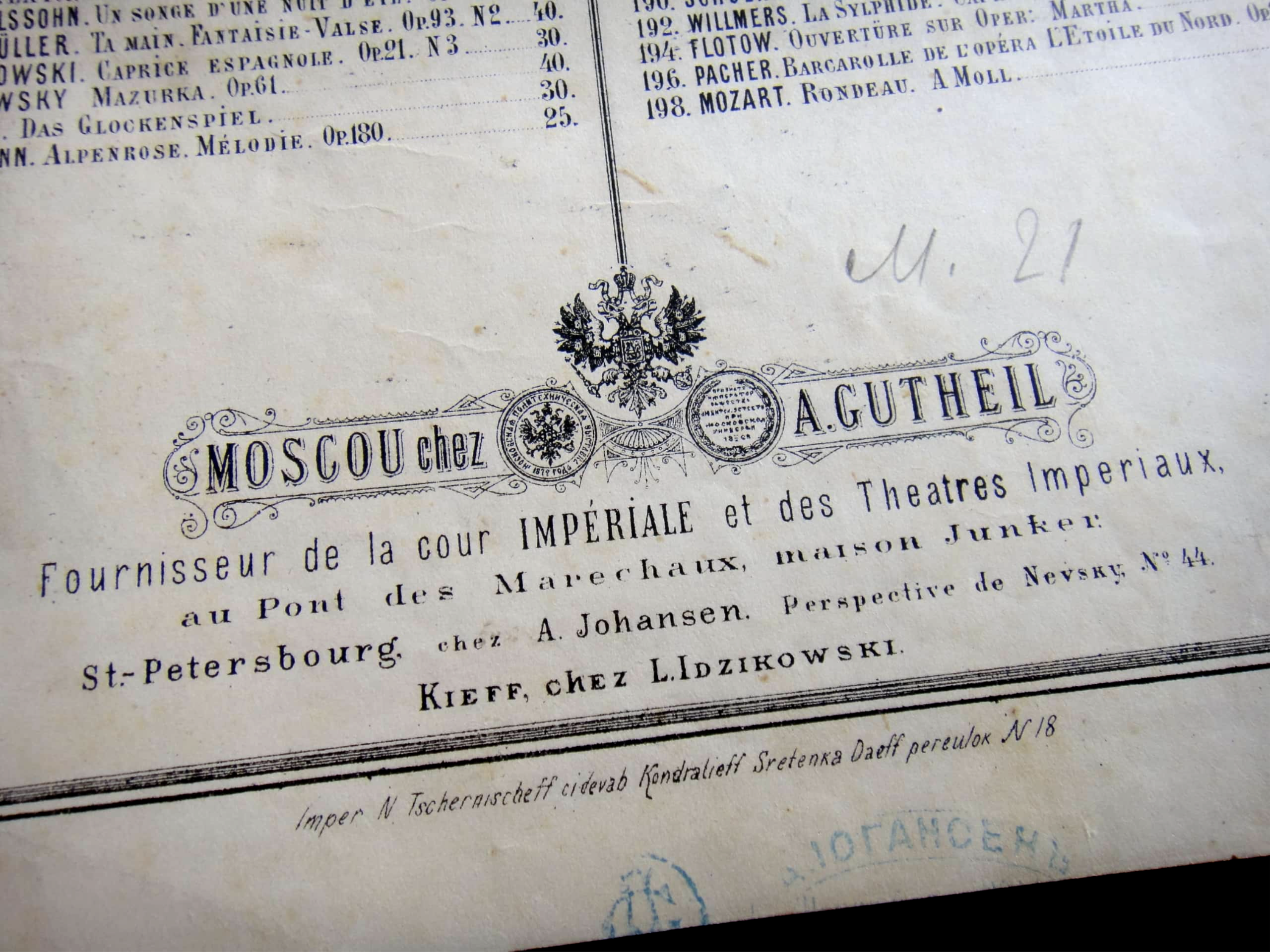 Москва, издатель Александр Гутхейль (№ 5513), поставщик Двора Его Императорского Величества и Императорских театров, на Кузнецком мосту в доме Юнкера