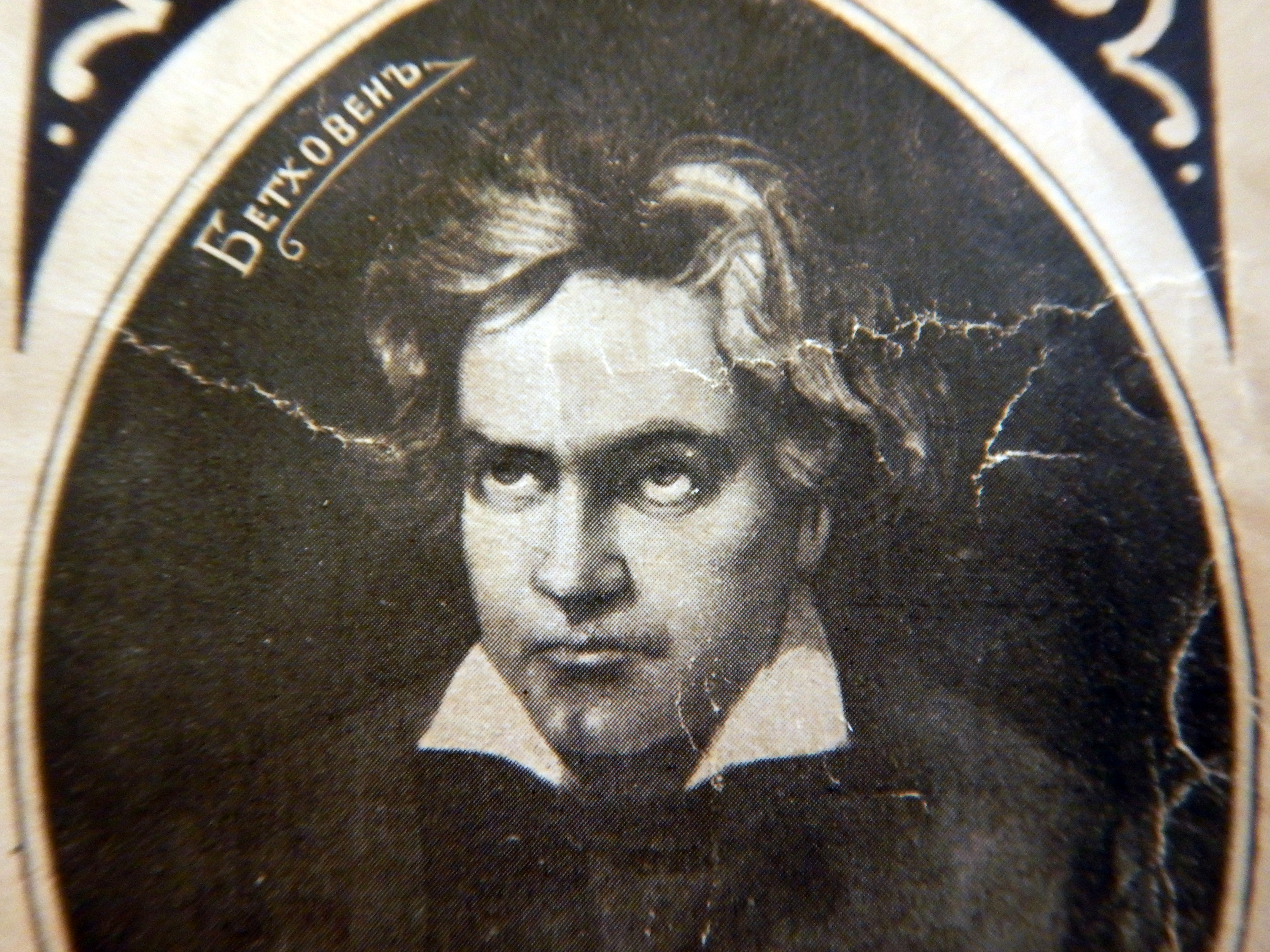 Всеми любимый и уважаемый Людвиг-ван (на портрете художника М. Ганина), кажется, тоже недоволен этой неразберихой с авторством: великий классик хмурится (впрочем, довольно добродушно) и смотрит вверх на своё имя «Бетховен», как бы подвергая сомнению всё происходящее; трещины старой бумаги удачно дополняют портрет, символично изображая «молнии» терзаний творческого гения.
