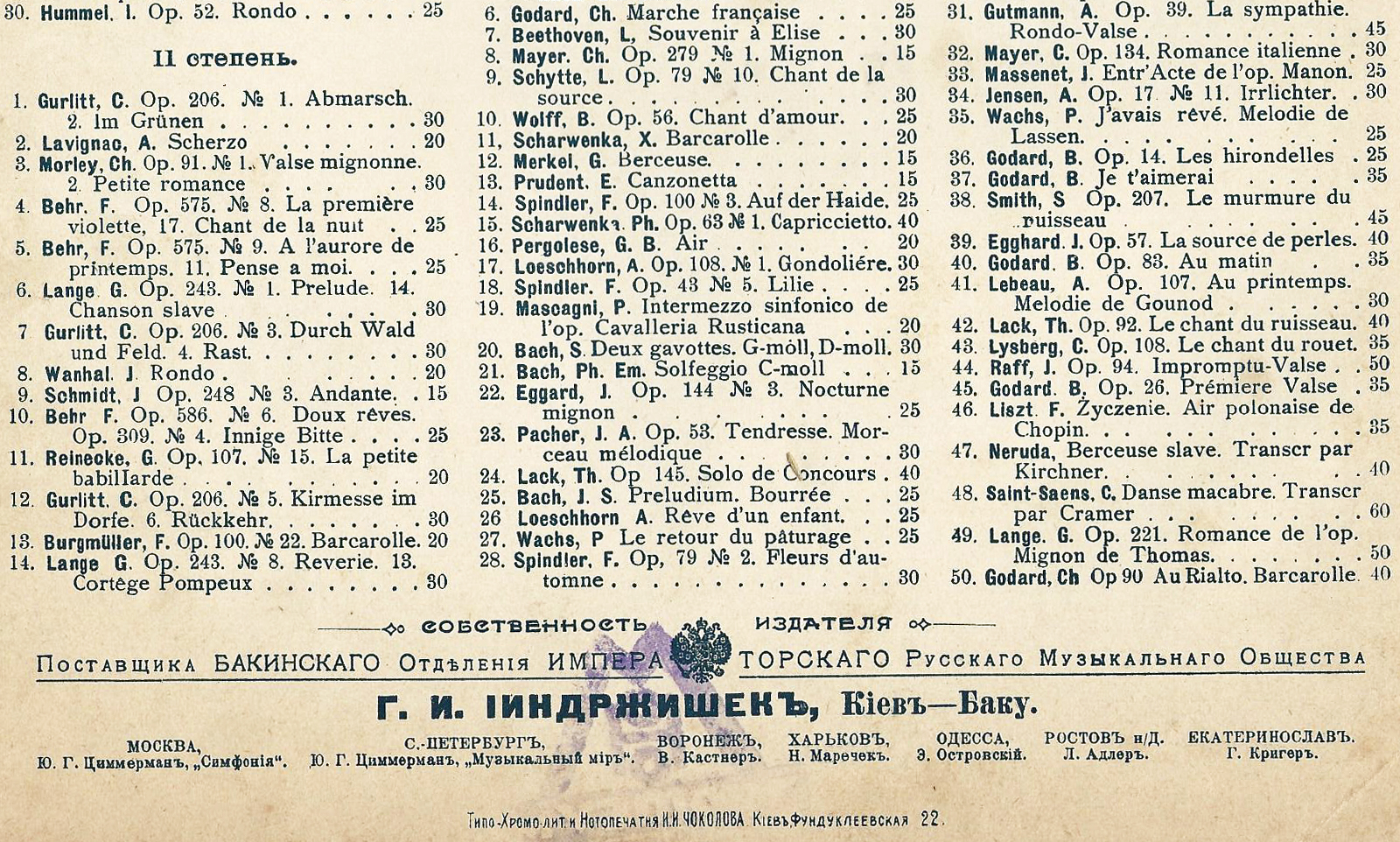 Киев и Баку, издатель Г. И. Йиндржишек [Г. И. Iиндржишекъ] (№ 401), поставщик Бакинского отделения Императорского Русского музыкального общества